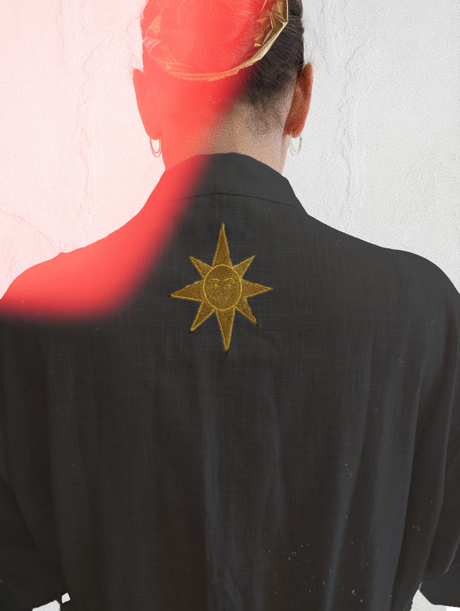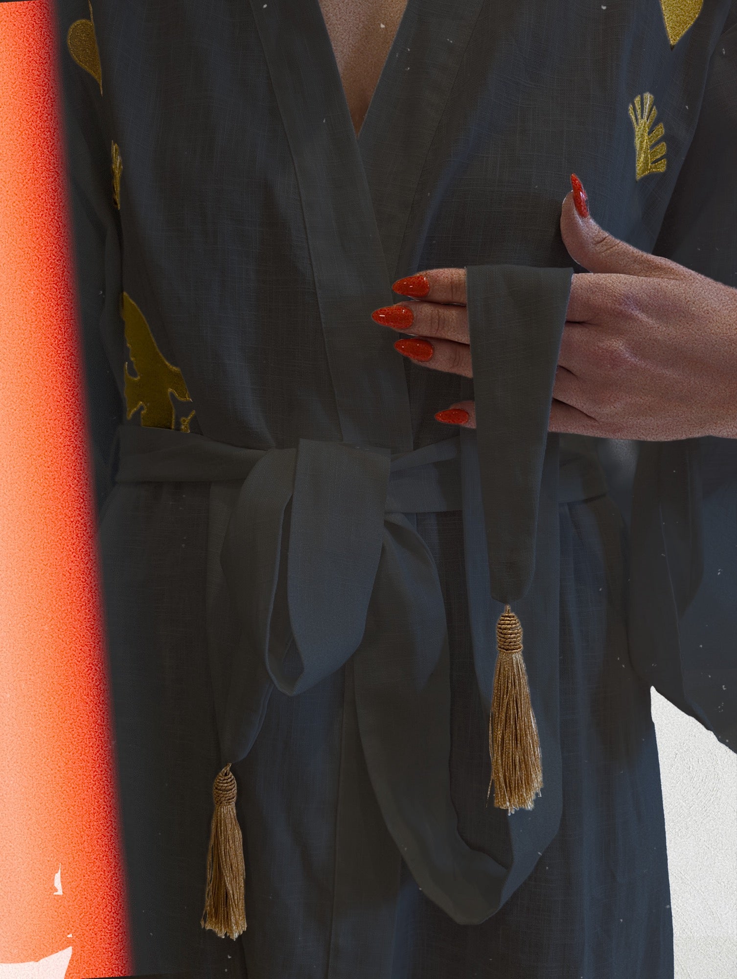 Our Dorothy and Rose black embroidered gold wrap gown is the ultimate elegant dress or beach cover up. Wear this outstanding work of art by the pool, to the restaurant or on the red carpet and you are guaranteed to be the center of attention.