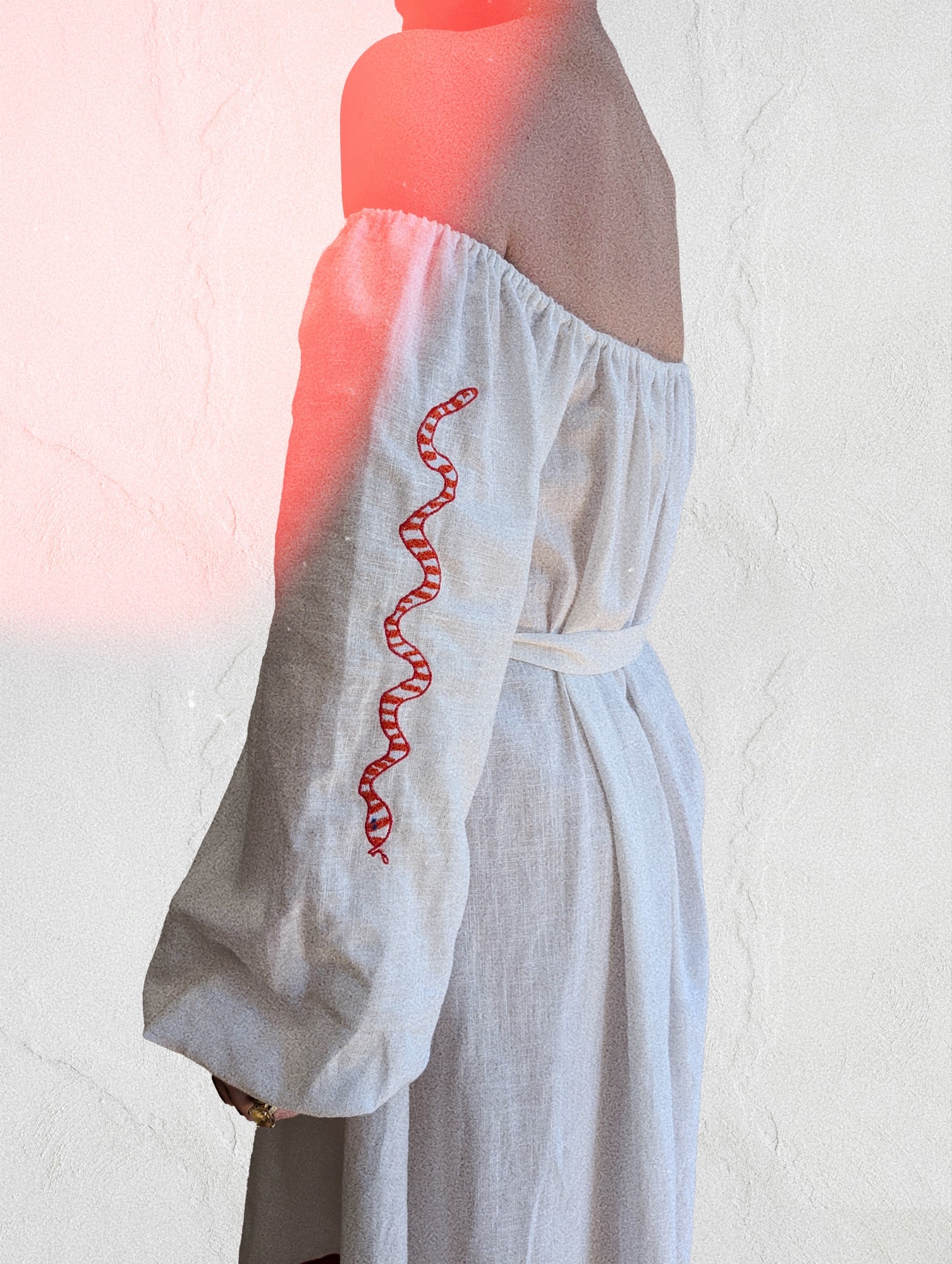 A Dorothy and Rose classic off the shoulder dress. The epitome of elegance.